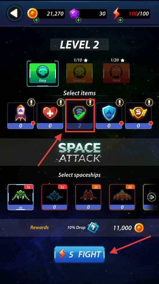 2、选择【Easy】难度,携带【2】个护盾道具,点击【5-FIGHT】,进入【LEVEL-2】战斗。