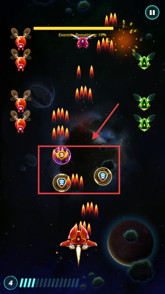 3、战斗中躲避弹幕,操控战机获取护盾和【S】道具,强化战力消灭更多敌机。