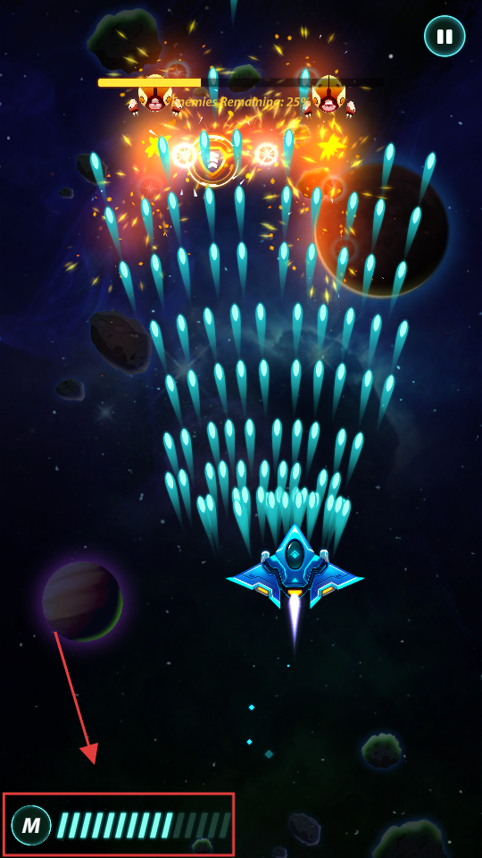 4、积累左下角【M】能量,满后释放技能,应对密集弹幕的敌机,提升作战效率。