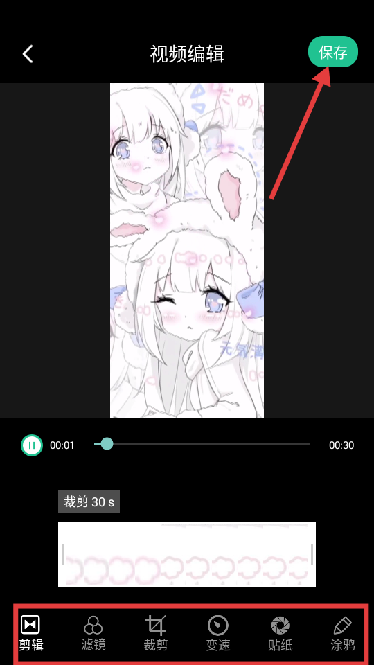 4、在视频编辑界面,完成编辑后点击【保存】按钮即可。