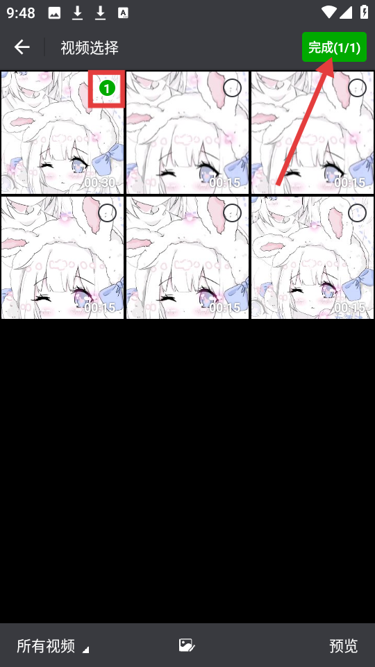 3、在视频选择界面,选中视频后点击【完成(1/1)】按钮。