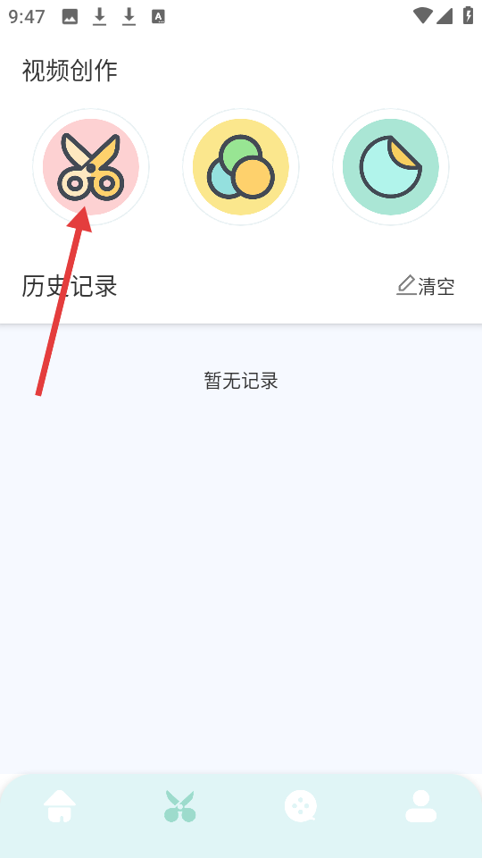 1、点击底部【剪刀】图标,进入视频创作板块。