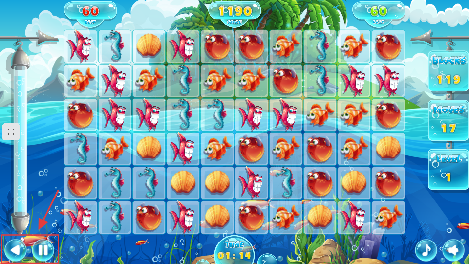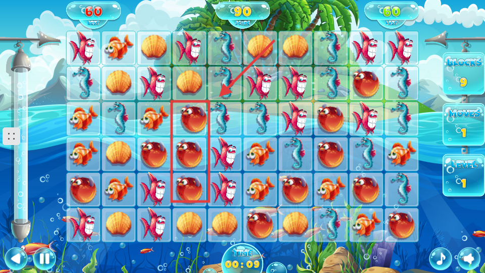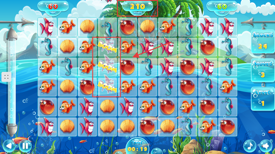 2、观察棋盘内【河豚】【海马】分布,凑齐三及以上同元素消除,获取分数推进关卡。