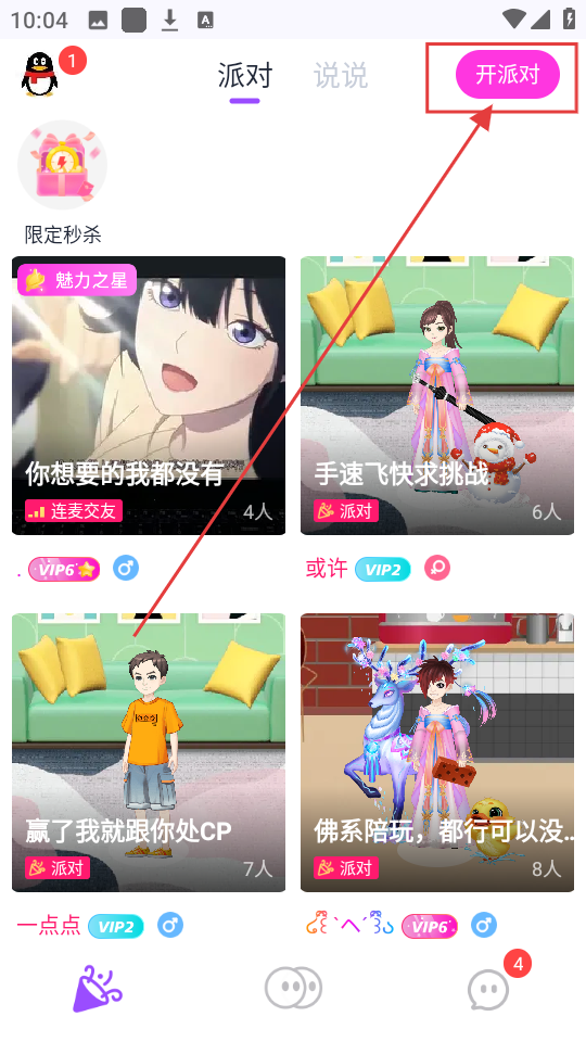 1、在派对页面,点击【开派对】,可进入开派对流程,准备创建派对啦。