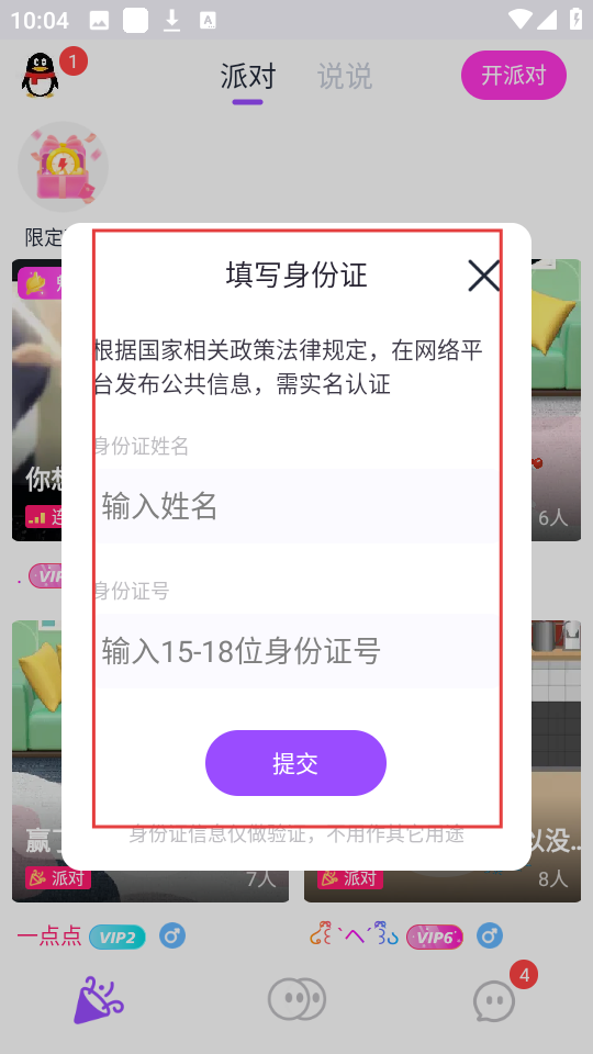 2、开派对前需填写身份证信息,完成实名认证,方可继续开派对操作哦。