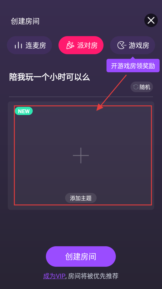 3、在创建房间页面,可选择派对房等房间类型,点击添加主题区域,添加派对主题啦。