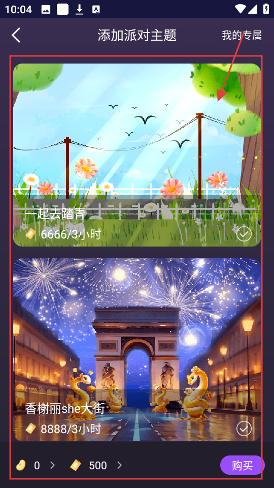 4、进入添加派对主题页面后,可选择喜欢的主题,完成主题添加,助力派对创建哦。