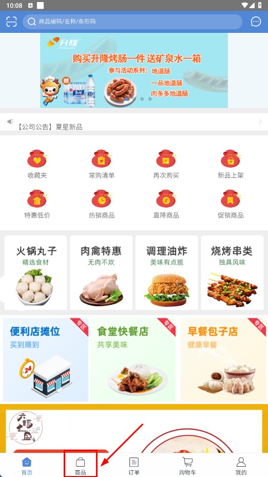 1、点击底部【商品-功能按钮】,进入商品分类页面。