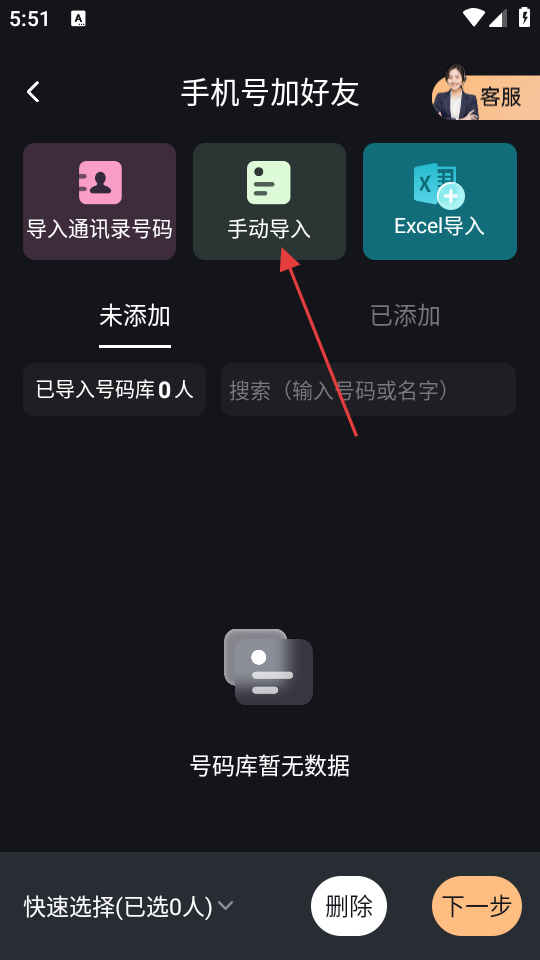 3、在手机号加好友页面中,点击【手动导入】选项,进入手动导入界面。