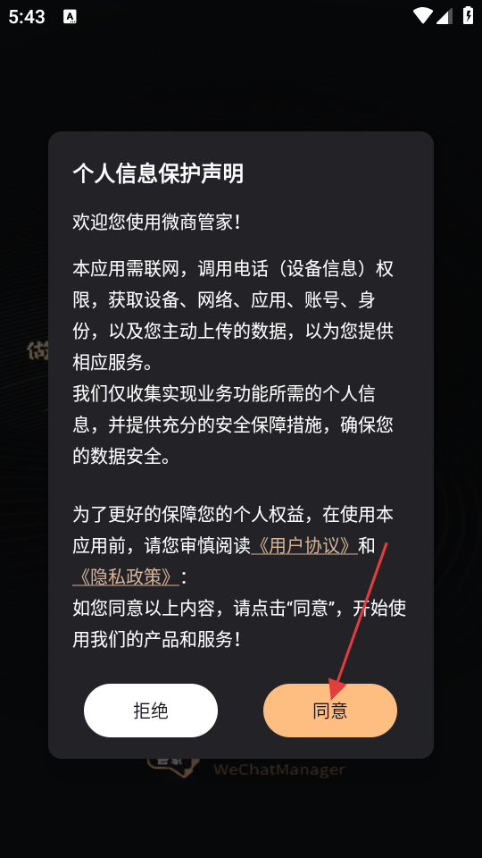 1、在个人信息保护声明界面中,点击【同意】按钮,进入微商管家主界面。