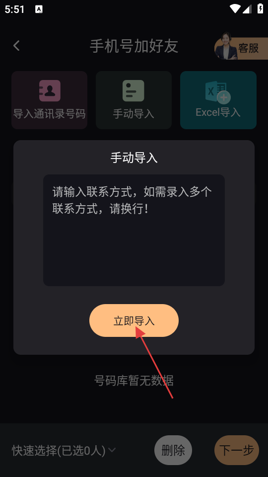4、在手动导入界面中,输入联系方式后点击【立即导入】按钮,完成号码导入。
