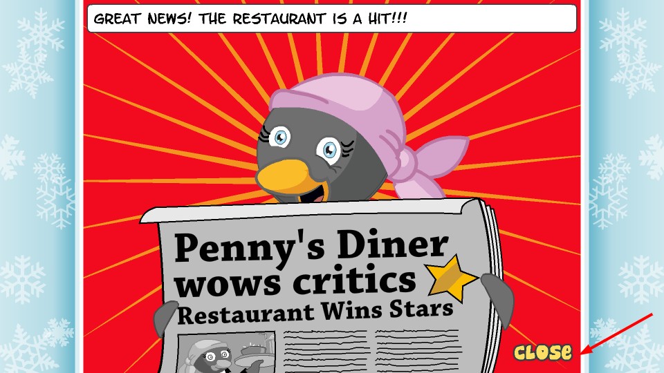 1、完成当日经营目标后会收到【Penny'sDiner】好评提示,点击关闭可进入后续统计界面查看收益情况。