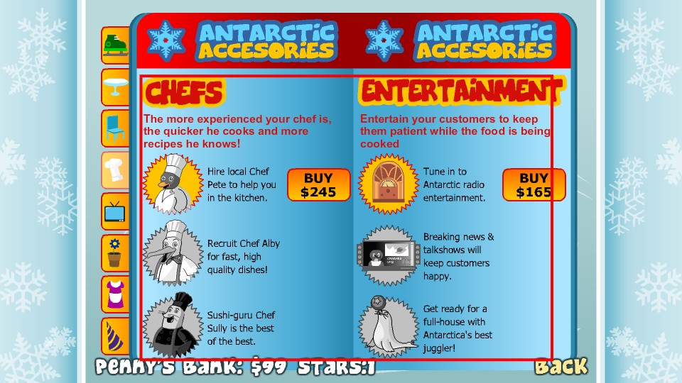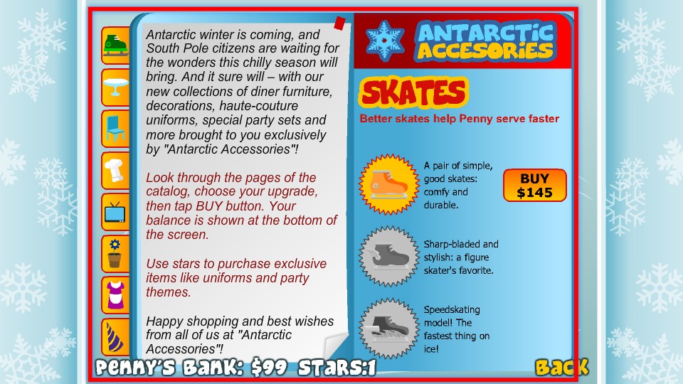 3、在【AntarcticAccessories】商店,攒够【145】元点击【BUY】买滑冰鞋,提升服务速度应对更多顾客。
