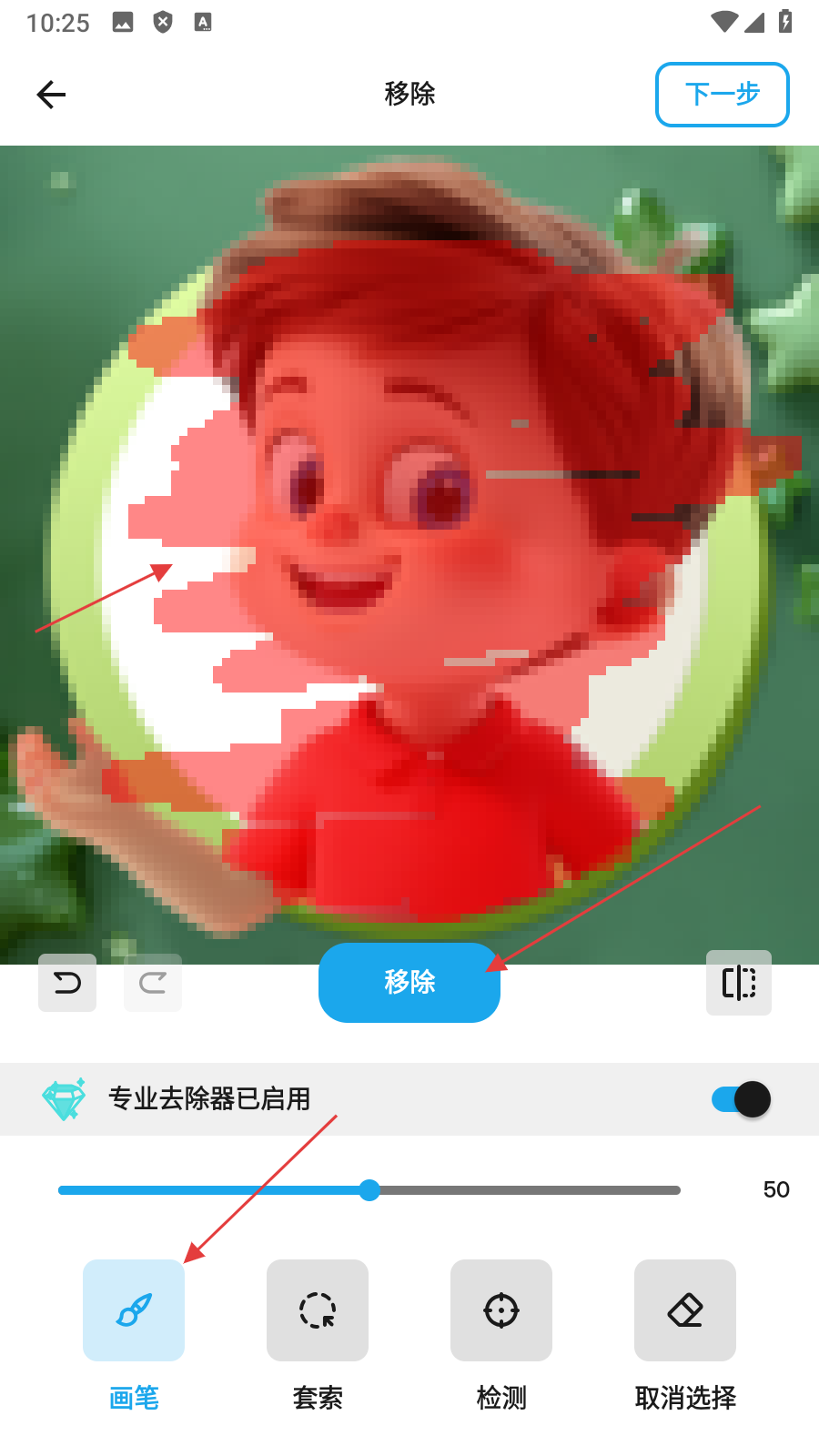 3、使用【画笔工具标记要移除的对象】后,点击【移除】,进行对象移除操作。