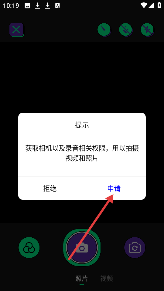 2、在权限提示框中,点击【申请】以获取相机及录音权限,用于拍摄视频和照片。
