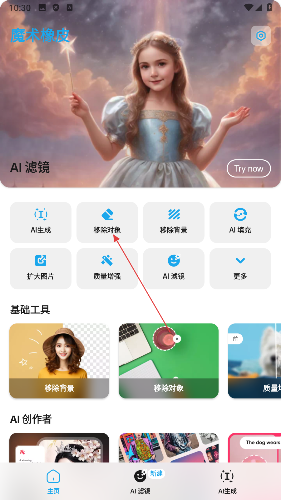 MagicEraser魔术橡皮擦是一个操作简单的图片处理工具,界面干净整洁、简约大气,支持多类实用功能,包括基本编辑、移除背景、扩大图片、质量增强、滤镜及一句话生成智能图片等。最新版操作简便,用户从照片中移除不需要的对象、人物、文字、标志或水印时,只需选中目标点击修复即可消除,无论是清除背景噪点、删除多余元素,还是进行专业照片编辑处理,都能高效完成,满足多样化图片处理需求。