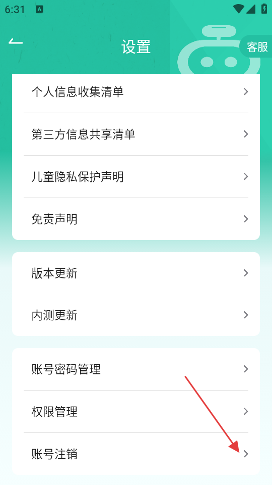 3、在设置界面里,点击【账号注销】选项,进入账号注销确认界面。