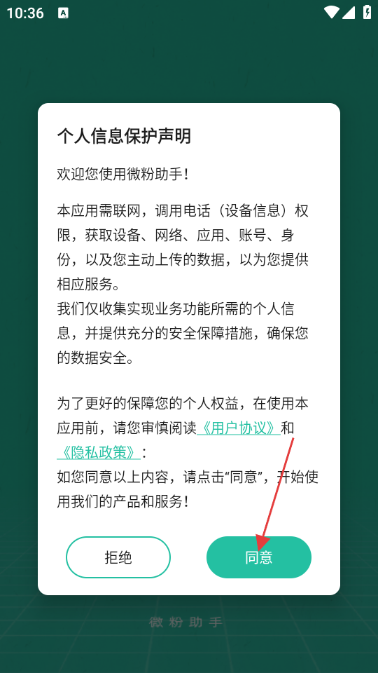 1、在个人信息保护声明界面,点击【同意】按钮,进入微粉助手主界面。