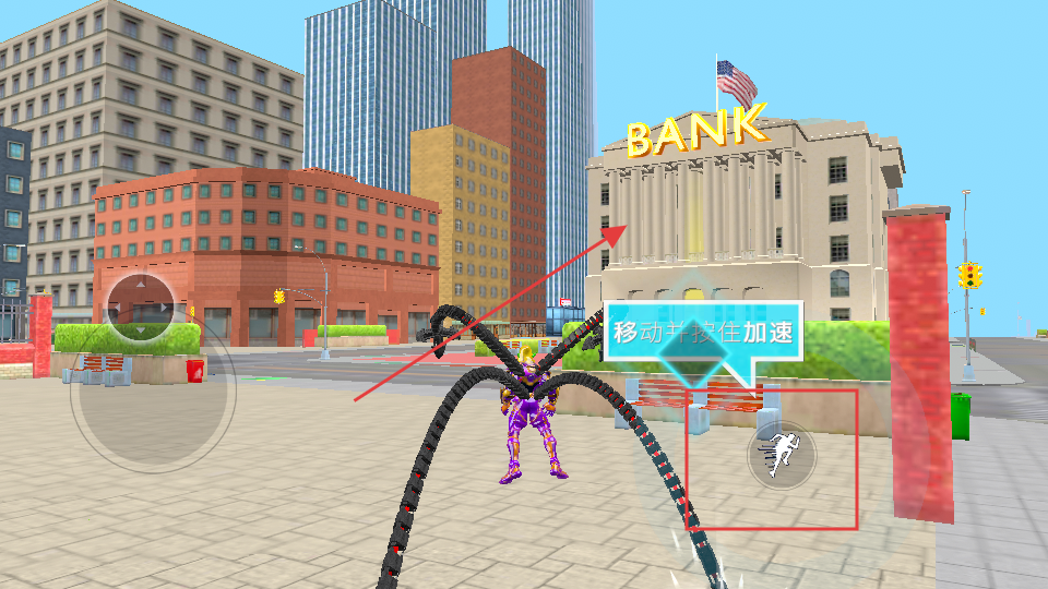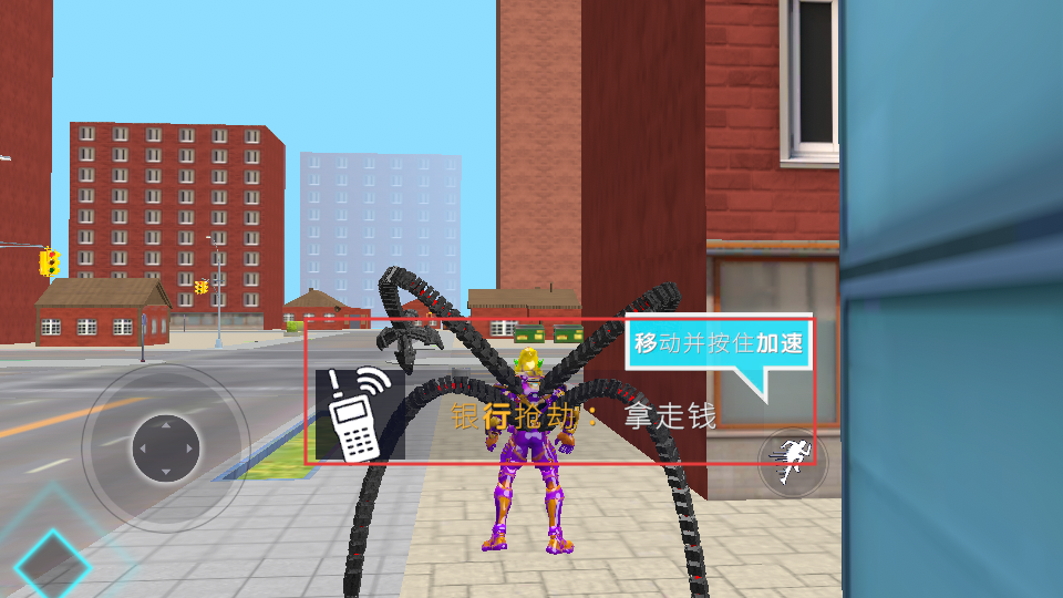 4、到达银行建筑后,继续移动并按住加速按钮进入银行区域,执行抢劫任务,积累资源以提升角色能力。