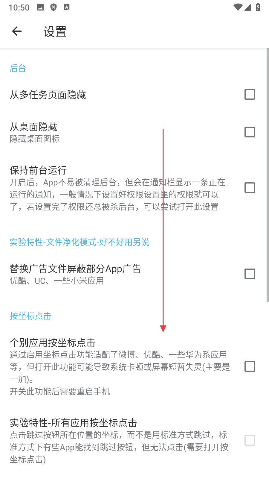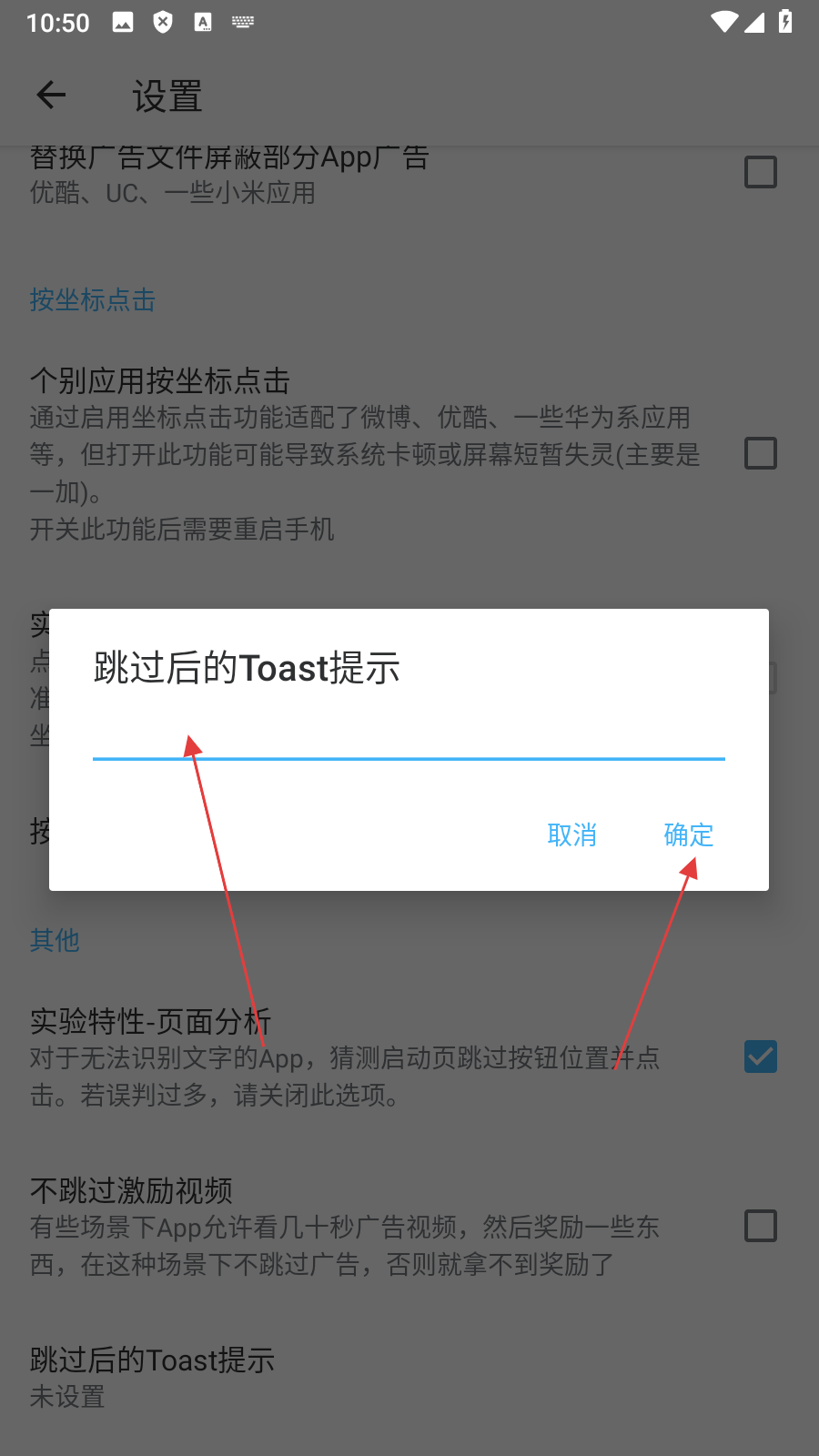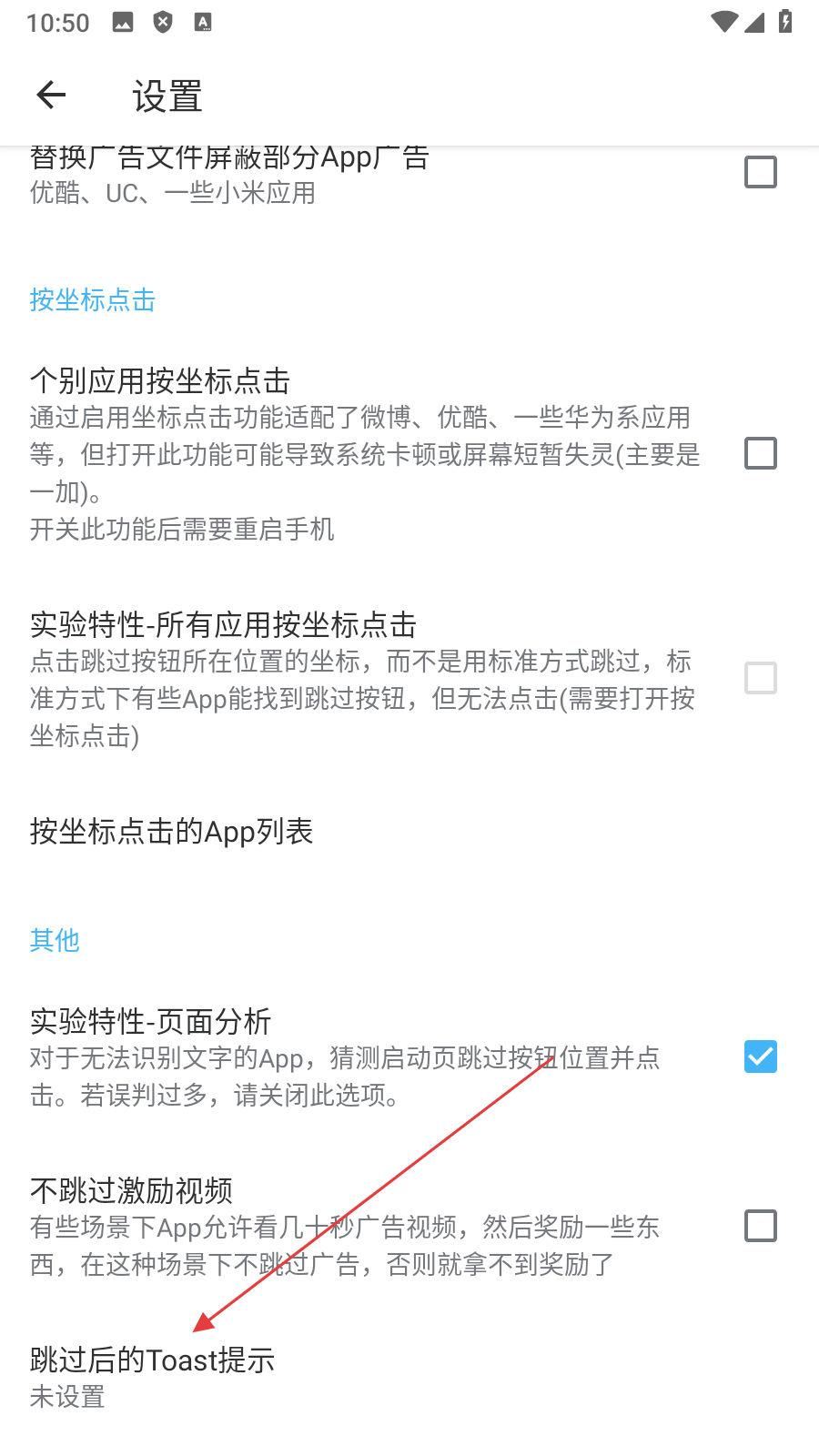 3、在设置选项中点击【跳过后的Toast提示】,弹出提示设置弹窗。