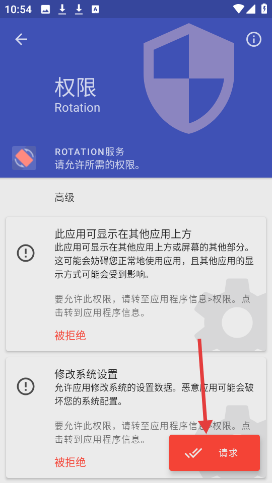 4、在Rotation应用权限页面,点击【修改系统设置】的【请求】按钮,申请对应权限。