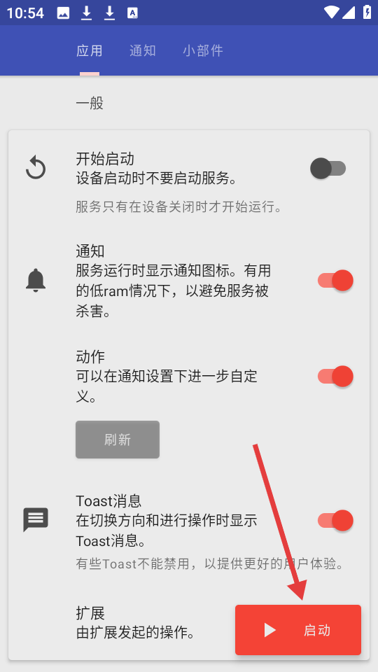 3、在应用设置页面,点击【扩展】旁的【启动】按钮,启动相关服务。