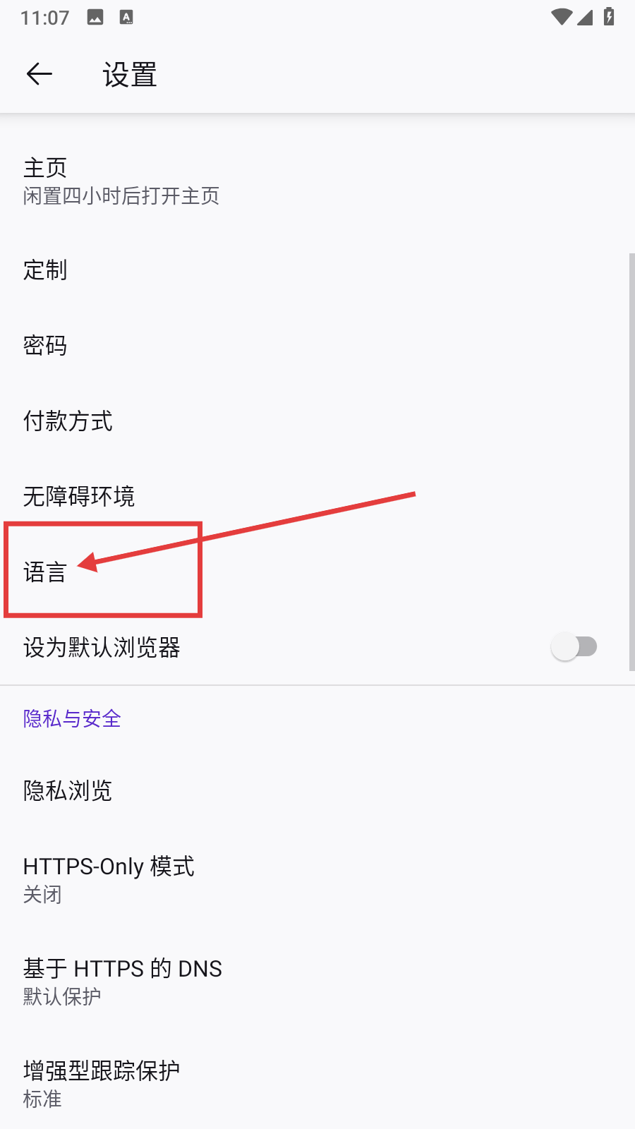 3、在设置页面中找到并点击【语言】选项,进入语言设置页面。