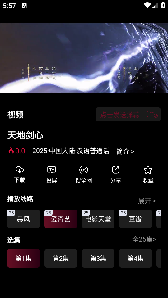 4、在播放页面中,可选择播放线路和集数,即可开始观看【天地剑心】。