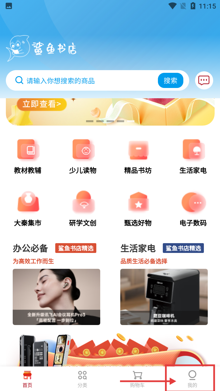 1、进入鲨鱼书店首页后,点击右下角【我的】,进入个人中心页面。