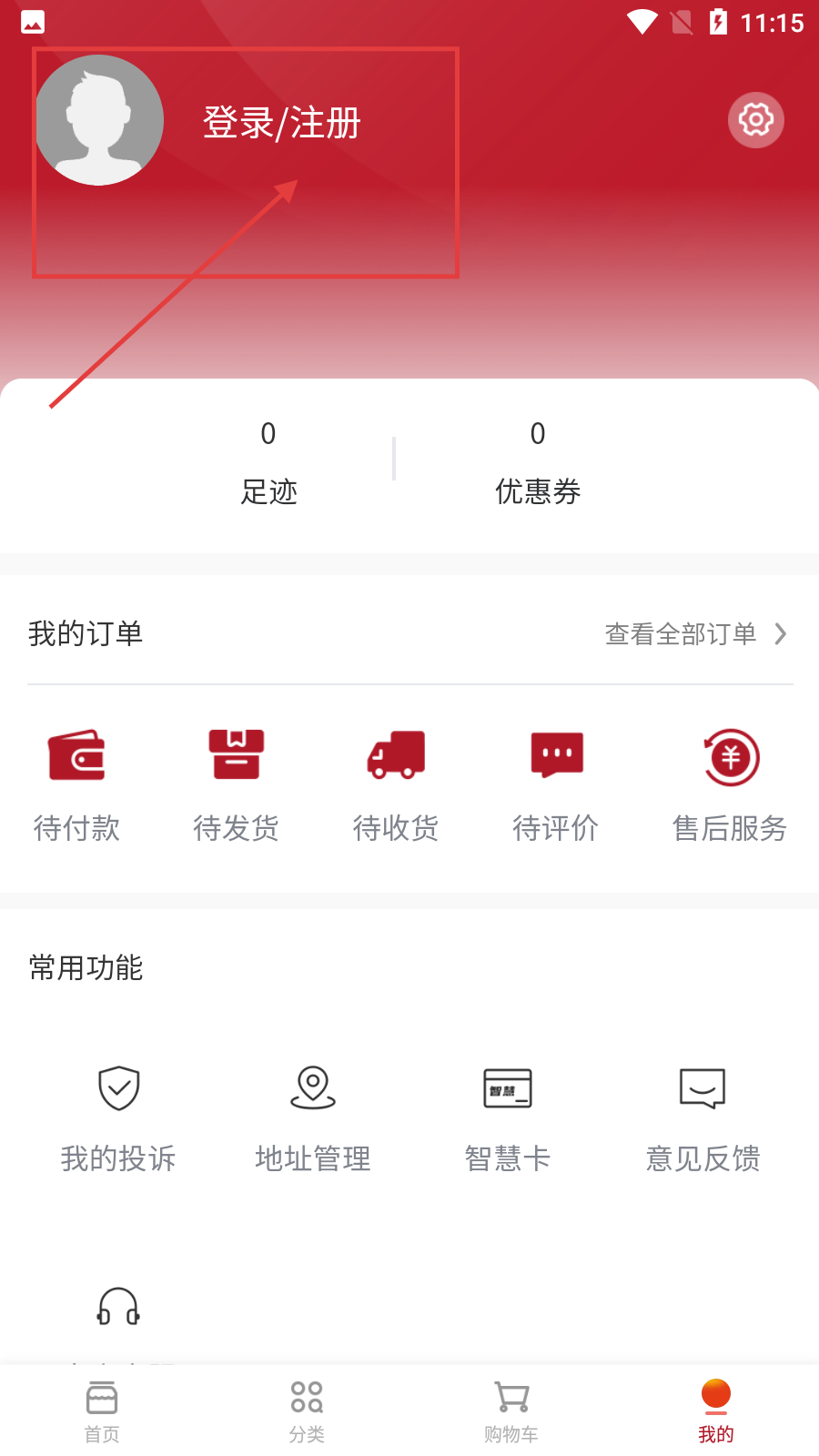 2、在个人中心页面点击【登录/注册】区域,进入登录界面。