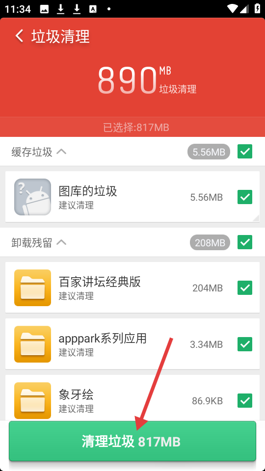 4、在垃圾清理页面,点击绿色的【清理垃圾817MB】按钮,清理已选择的垃圾文件。