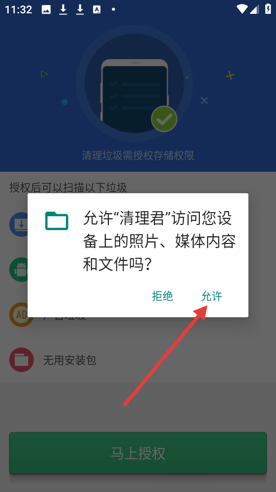 3、在权限询问弹窗中,点击【允许】按钮,授予清理君访问设备存储的权限。