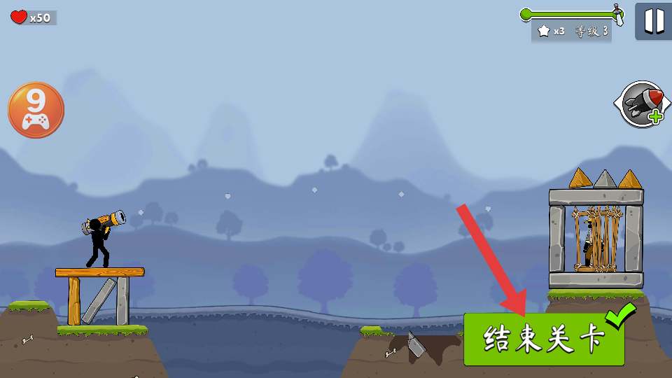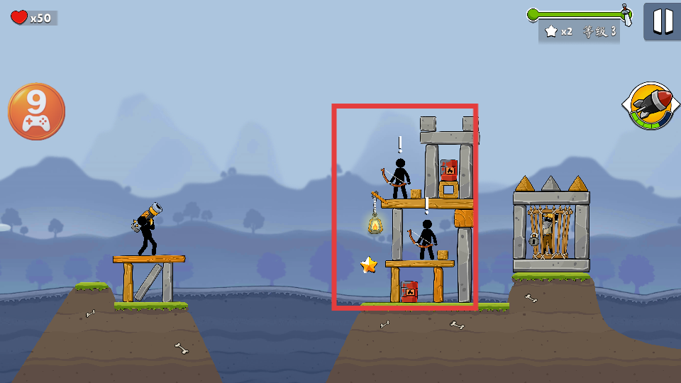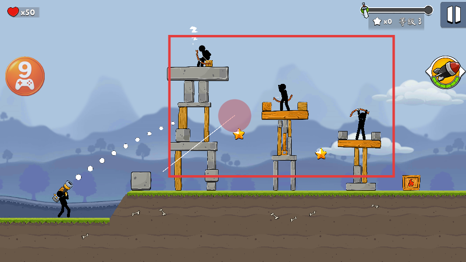 3、继续瞄准剩余敌人的建筑,发射火箭弹,逐步消灭所有敌人,收集星星提升评分。