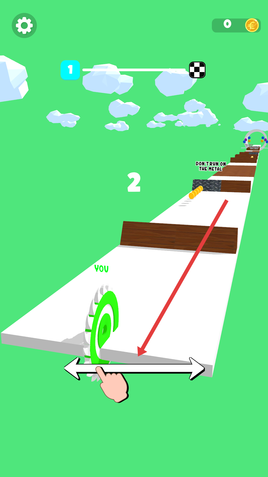 3、在赛道上持续前进,锯开木板等可破坏的物体的同时收集金币,朝着终点线前进。