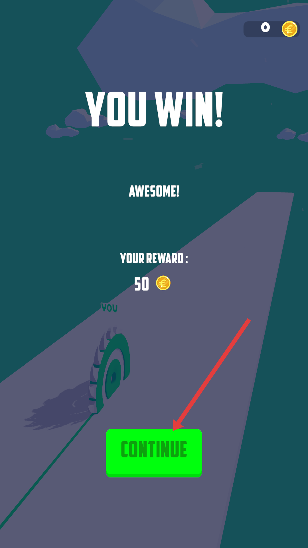 4、到达终点后,点击【CONTINUE】按钮,继续挑战下一关,获取奖励金币。