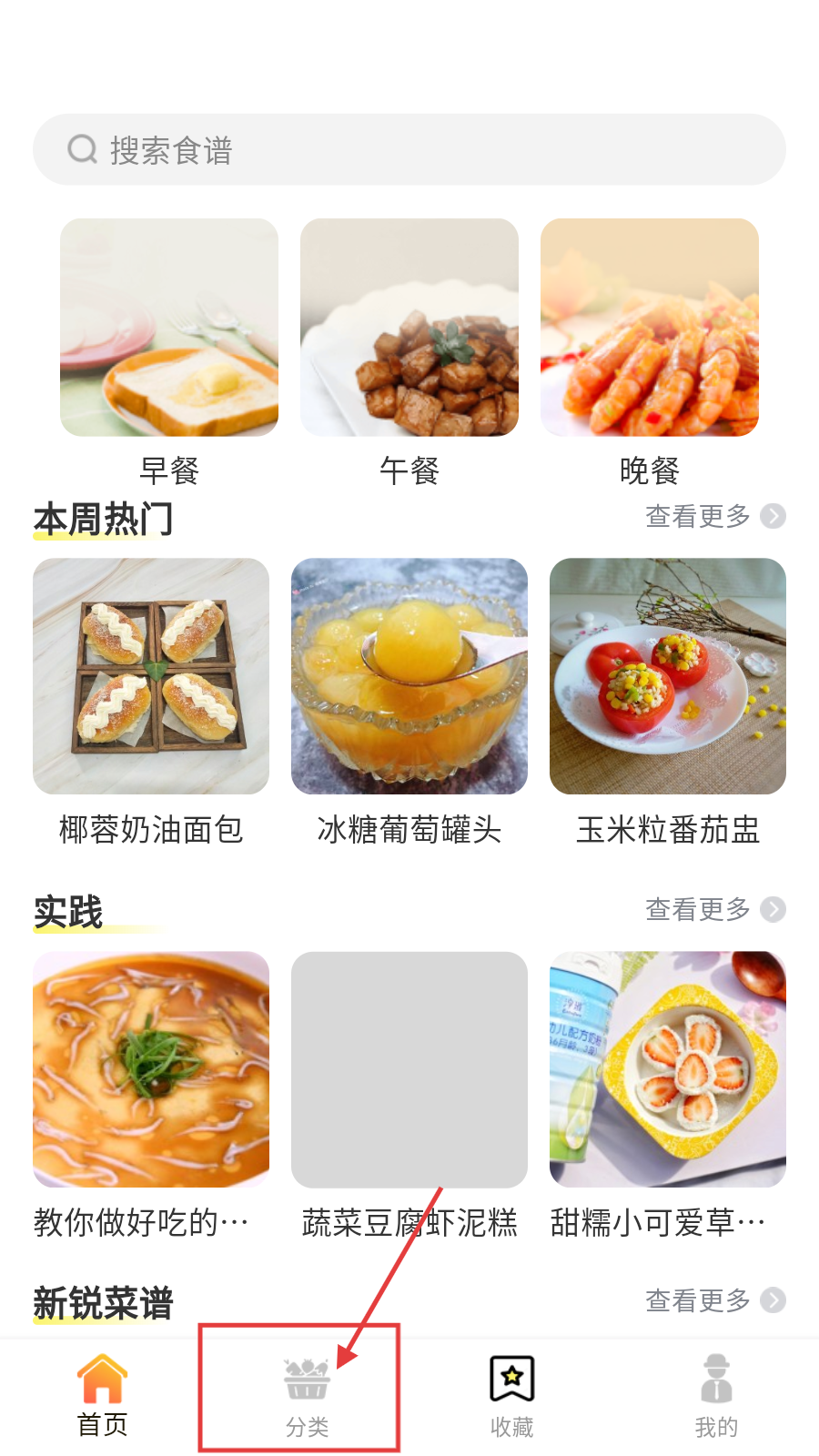 1、进入菜谱APP首页后,点击底部【分类】,进入分类页面。