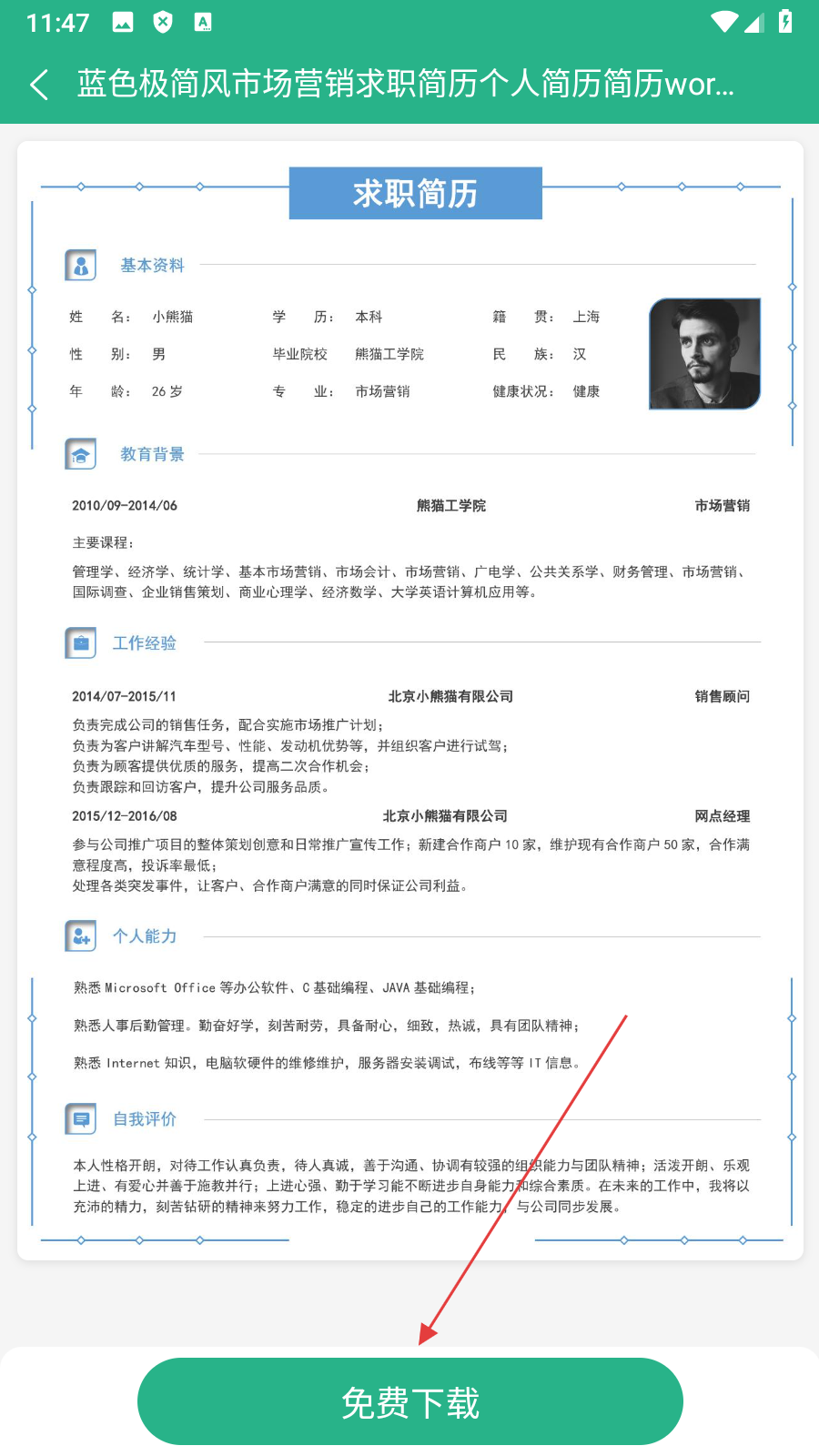 4、在文档详情页面点击【免费下载】,即可完成文档下载操作。