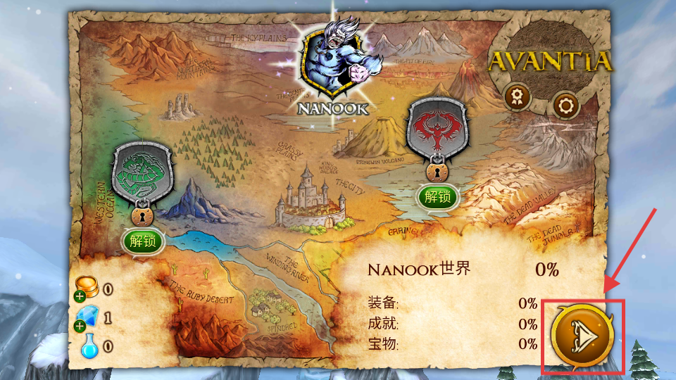 1、点击【NANOOK】世界右下角箭头按钮进入,解锁地图区域,收集【金币】-【钻石】-【药水】等资源,推进游戏。
