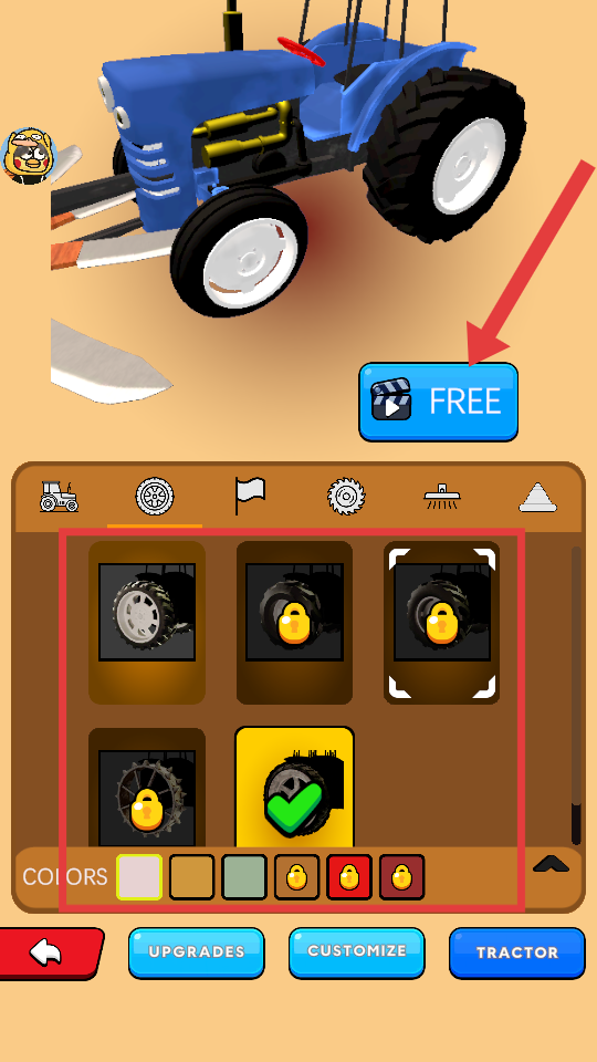 2、在自定义界面中,点击【free】解锁不同款式的拖拉机和车轮等部件。