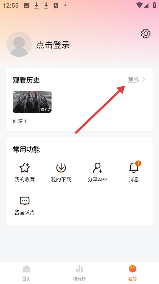 2、在个人中心页面,点击观看历史旁的【更多】按钮,查看全部观看历史。