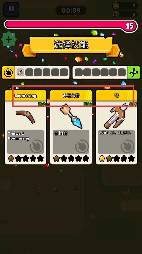 2、选择技能,如Boomerang、神秘的箭、弩,增强角色的攻击手段。