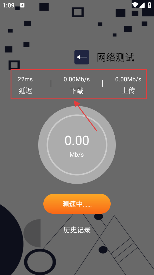 4、测速完成后,可查看网络的延迟、下载速度、上传速度等信息。
