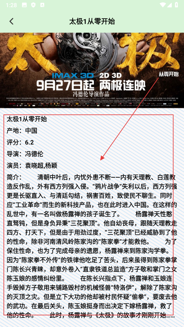 4、滑动后即可查看影视的【产地、评分、导演、演员及简介等详细内容】。