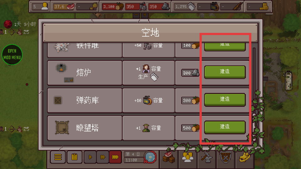 2、选择建造铁件堆、熔炉、弹药库、瞭望塔等设施,提升资源存储、生产和防御侦察能力。