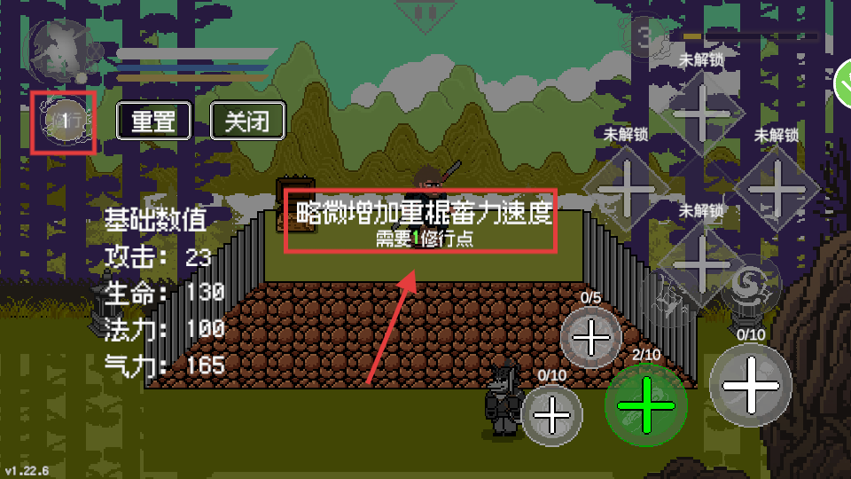 4、在【修行】界面,消耗【1-修行点】升级【重棍蓄力速度】,提升战斗效率。