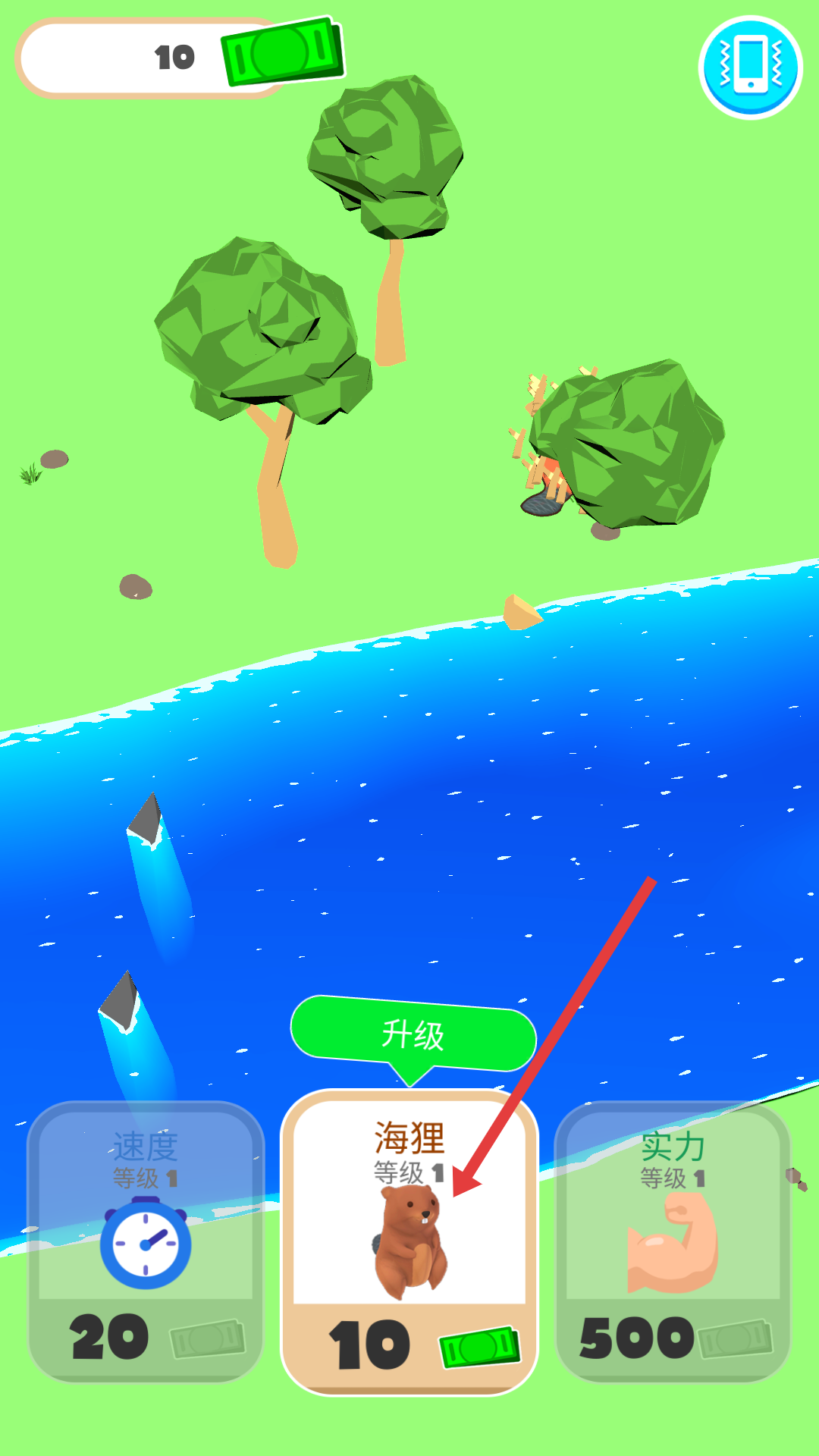 1、点击【海狸-等级1】升级选项,消耗10货币提升海狸等级,增强其伐木效率以获取更多资源。