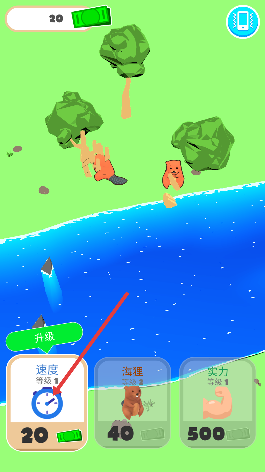 2、选择【速度-等级1】升级项,花费20货币提升伐木速度,让海狸更快完成伐木任务。