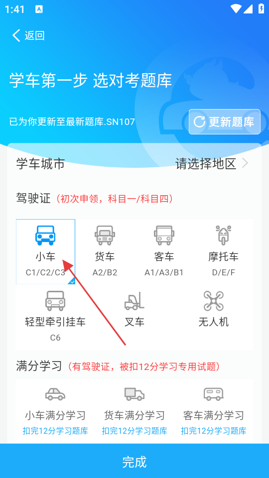 1、在选库界面,选择学车类型如“小车”,点击【完成】可进入驾考精灵主界面。