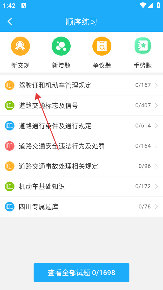 3、在分类界面,选择要练习的知识点分类如“驾驶证和机动车管理规定”,可进入题目练习界面。