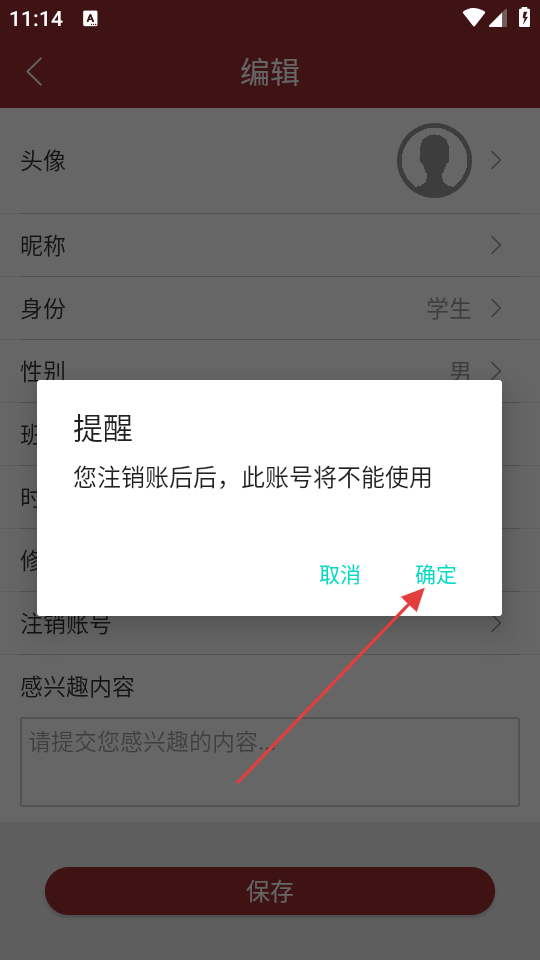 3、在编辑页面里,点击【注销账号】选项,弹出注销提醒框。
